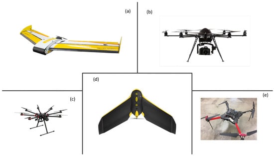 (a) The QuestUAV 200 UAV. (b) The MK Okto XL 6S12. (c) The DJI S1000. (d) The eBee Classic. (e) The Hover.