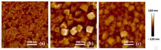 Atomic force microscope (AFM) images of the S group samples; (a) S1—100 °C; (b) S2—150 °C; (c) S3—250 °C.