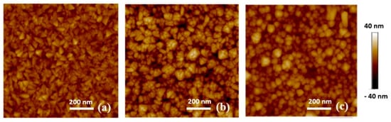 The AFM analysis of samples in the S group and D group are shown in Figure 1 and Figure 2. The roughness values, Ra, for these samples are listed in Table 2. The roughness is assumed to increase as the grains tend to coarsen with increasing substrate temperature. From Figure 1b, the sample deposited at 150 °C shows deep voids and protruding grains which leads to a higher roughness than that for sample S3. However, based on Figure 1c, the thin film deposited at 250 °C is denser than that deposited at 150 °C, which is expected in accordance with the higher temperature. The likely reason behind this is that increasing the substrate temperature significantly enhances the lateral mobility of the condensing sputtered target atoms. Temperature-activated incoming depositing atoms tend to fill up the voids instead of self-shadowing, which in turn densifies the film material.