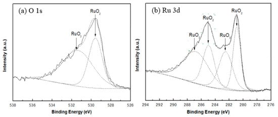 All peaks in the spectra were charge corrected with respect to the C 1s peak (284.6 eV). The Ru doublet peak (Ru 3d3/2 and Ru 3d5/2) and Ru 3p peaks were identified in the wide spectral scan. Since the adventitious C 1s peak at 284.6 eV coincides with the Ru 3d3/2 peak, the use of the Ru 3d peaks for qualitative and quantitative analysis is not reliable, but there have been a few studies using the assignment of Ru 3p peaks for ruthenium oxides, especially for RuO3 peaks [16]. Thus, fitting of the Ru 3d peaks is used for identification, while the Ru 3p3/2 peak fitting is used for ratio calculations. Figure 3 shows the peak fitted spectrum for both O 1s and Ru 3d for sample S1.