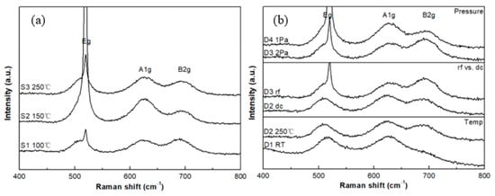 The Raman spectra for samples in groups S and D are shown in Figure 4. Three Raman-active modes, e.g., A1g and B2g can be observed in the Raman spectra and analysis of spectra for these films can provide insight into the phase constitution of each sample. The B1g mode is too weak to be observed. For the thinner films, there is a combination of RuO2 and Si peaks at the, e.g., mode region for each sample. The possible reason is that the RuO2 thin film is deposited with a nm-scale thickness onto the Si substrate, so the incident laser penetrates the RuO2 thin film and interacts with the Si substrate. In this case, peak fitting is applied to specify the position of the, e.g., frequency mode and is also used to assign the peak position of the A1g and B2g modes for RuO2.