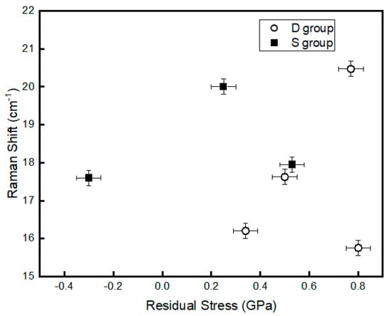 The three major Raman-active modes, e.g., A1g and B2g for single-crystal RuO2 are located at 528, 644, and 716 cm−1, respectively [22,23]. In this experiment, all the three Raman-active modes show a red shift in the peak location. The red shift has a linear relationship with the residual stress according to Meng and Dos Santos [24]. In fact, the stress should have an influence on all modes, but the stress effect on A1g mode is greater than the others [24]. Figure 5 shows the relationship between the A1g peak position and the residual stress of the S and D groups. In the case of the group D samples, films D1, D2, and D3 show that the Raman shift increases with the residual stress linearly. Sample D4 (stress = 0.82 GPa) falls out of the trend as it is the only sample deposited at a lower pressure (1.0 Pa) than the other three samples deposited at 2.0 Pa. The deposition pressure influences the bombardment energy of the depositing atoms resulting in the modifications of the properties of the films such as texture, morphology, composition and stress. The data of the group S show a non-linear relationship. This difference in the trend can be attributed to the surface morphologies and film texture between the two groups of samples. In addition, the increasing percentage of RuO3 for group S sputtered from the metallic cathode that alters the O/Ru ratio. Parker et al. [25] indicated that the Raman peak positions are dependent on the O/Ti ratio in TiO2 films.