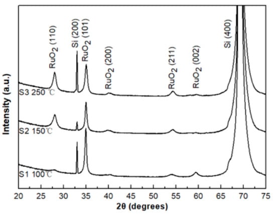 - Samples S1–S3 were deposited by reactive RF sputtering from a metallic cathode target (Ru) with a fixed oxygen partial pressure (Ar/O2 ratio of 4/1), total pressure (2.0 Pa), RF power (125 W), and deposition time (20 min). The substrate temperature was varied from 100 to 250 °C.