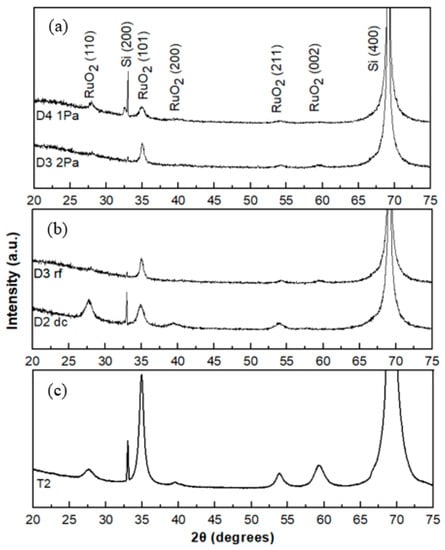 RuO2 thin films were deposited using a magnetron sputtering system equipped with an axial turret magnetron head and power supply (AJA DCXS-750, Scituate, MA, USA). The turret head was mounted vertically in the bottom of the vacuum system. The target materials used for sputtering were metallic (Ru) cathode and oxide (RuO2) cathodes of high purity (>99.0%). The nominal size of the sputter targets was 50 mm in diameter and the distance between the cathodes and the substrate was set at 60 mm. The films were deposited onto (100) conducting silicon wafers with a resistivity of 0.05 Ω-cm. The substrates size was 25.0 mm × 25.0 mm. The substrates were electrically grounded. The deposition system was equipped with rotary and cryogenic pumps and a controlled gas introduction system. A base pressure of 1 × 10−4 Pa was attained in the chamber before the deposition. The oxygen reactive gas and argon inert gas were introduced into the chamber depending on the sputtering target used. The deposition pressure could be set independently of the gas flow by adjusting a throttle valve. The RF or DC powers were set at 100 W or 125 W, respectively. The deposition times varied between 15 to 40 min. The film thickness variation across the substrate was in order of 10.0%. Three groups of RuO2 thin films were prepared as outlined in Table 1.