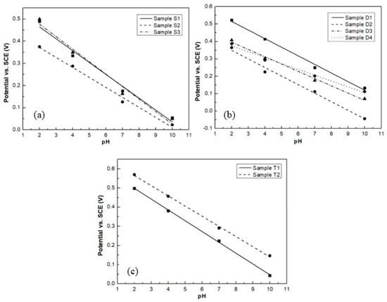pH sensitivity of samples (a) S group; (b) D group; (c) T group.