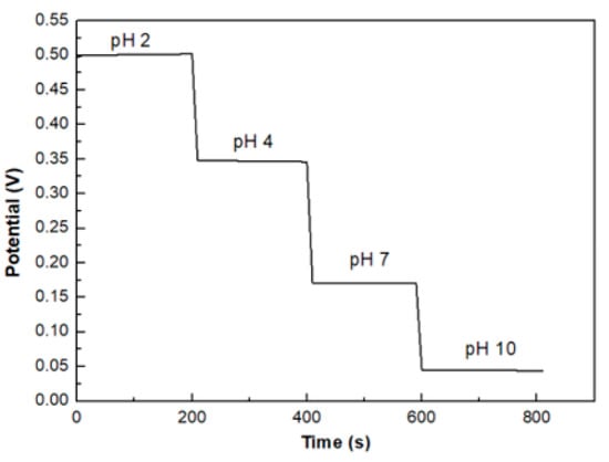 All the samples show a stable output potential for all pH values over time, except sample S2 that exhibited a potential drift for both acidic and alkaline solutions. Figure 10 shows the potential versus time at different pH buffer solution of sample S3 as a representative example where the stability of the output is clearly evident.