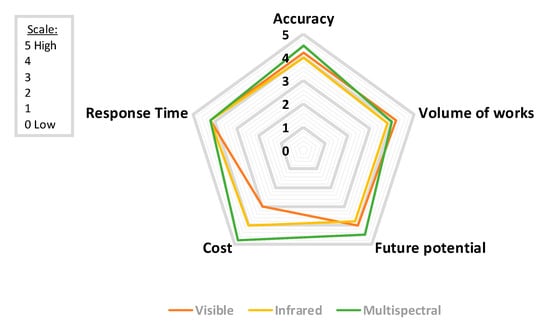 Similarly, Figure 4 demonstrates some attributes for each of the three sensor types: visible, infrared, and multispectral. Although the research community has thoroughly utilized optical-based systems, multispectral approaches seem to achieve better accuracy rates, due to the complementarity of information provided by different spectral bands; however, the use of multispectral technology increases significantly the overall cost of the system. This fact justifies the extensive use of low-cost optical sensors by many research works in the literature. Nevertheless, the wider use of multispectral sensors in different systems is expected to further improve the performance of early wildfire detection systems. To this end, extensive research is still needed on systems that integrate multimodal sensing technologies along with advanced deep-learning algorithms.