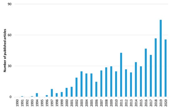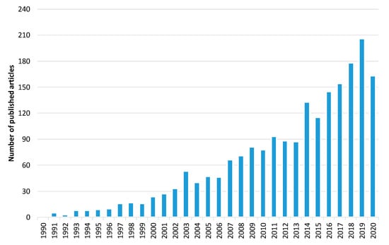 The number of published articles per year related to forest fire detection. Data retrieved from Web of Science [] for dates between 1990 to October 2020.