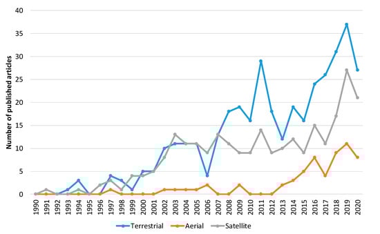 The number of published articles per year for terrestrial, aerial, and satellite-based systems. The analysis was performed for forest fire detection in the imaging research area. Data retrieved from Web of Science [] for dates between 1990 to October 2020.