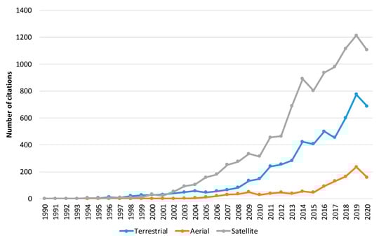 The number of times cited the published articles per year for terrestrial, aerial, and satellite-based systems. The analysis was performed for forest fire detection in the imaging research area. Data retrieved from Web of Science [] for dates between 1990 to October 2020.