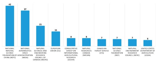 Organizations and agencies that funded most of the published articles for forest fire detection in the imaging research area. Data retrieved from Web of Science [] for dates between 1990 to October 2020.