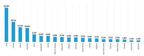 Authors’ affiliation by country (%) for forest fire detection in the imaging research area. Data retrieved from Web of Science [] for dates between 1990 to October 2020.