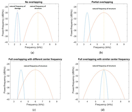 39]. The impulsive disturbance is broadband, it excites the resonance frequency of machine and it is present in a wide frequency band. Let us assume there are present two different damages in the machine, both local and impulsive (so broadband) but with smaller energy (thus, not so broadband as disturbances). In most of the cases, the damage-related excitation and disturbance-related excitation will affect similar or even the same frequency band. The location of damage in the frequency domain may be different depending on machine geometry—or design factors in general. Therefore, the center frequency of disturbance will be the same (as the natural frequency of the structure), however, the center frequency of damage may depend on damage location (what bearing) and fault type (outer/inner race). The width of disturbance in the frequency domain is related to the nature of the process—in our case, it may change according to the impact caused by a falling piece of the ore and it has a random behavior. The width of the fault spectral signature may depend on load, fault size and type, the overall level of noise, etc.