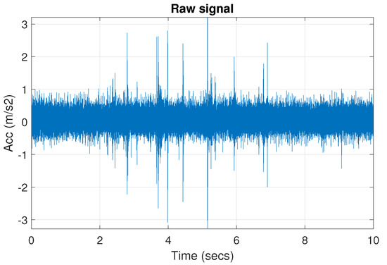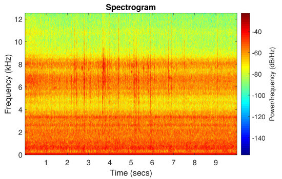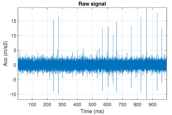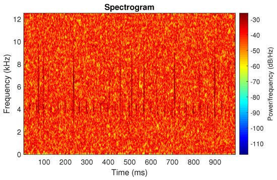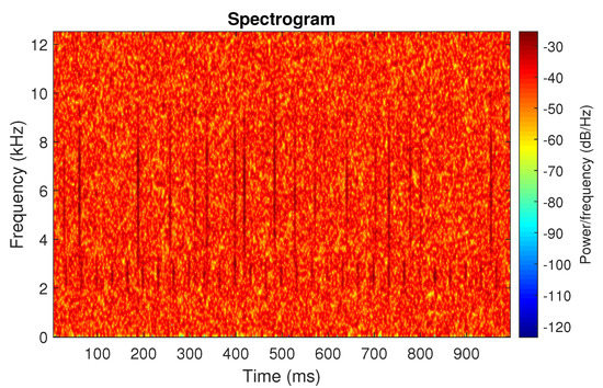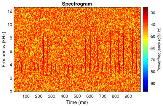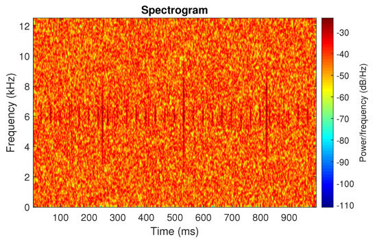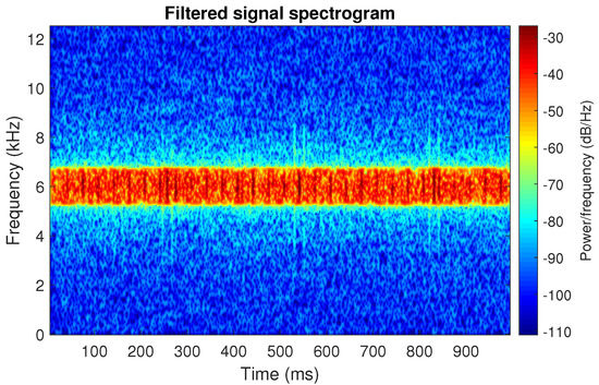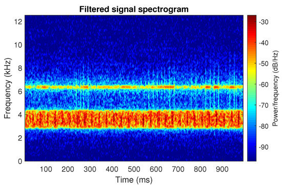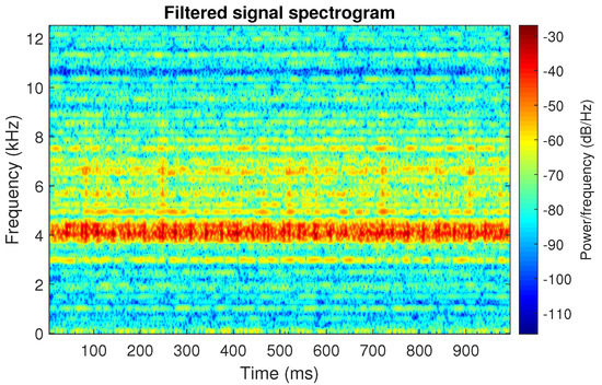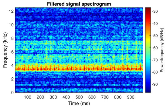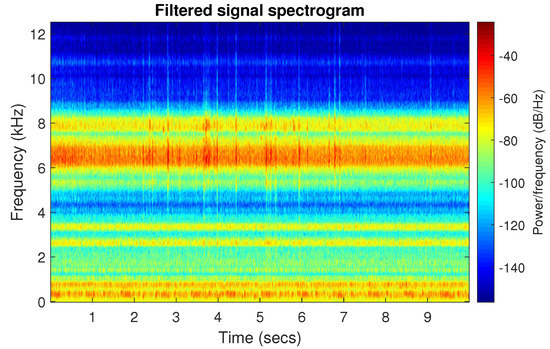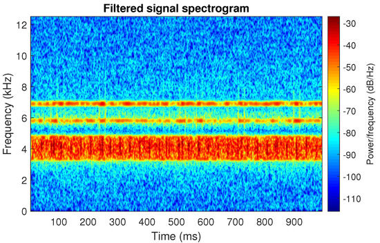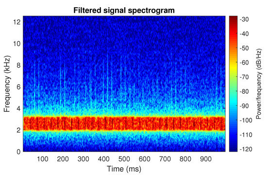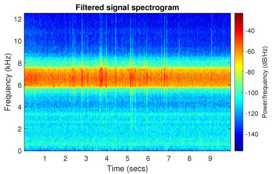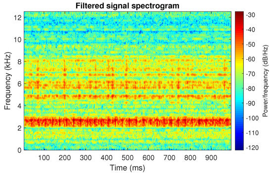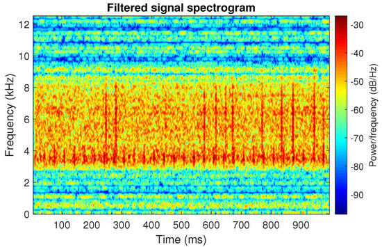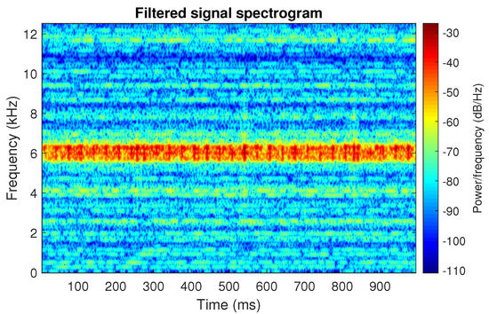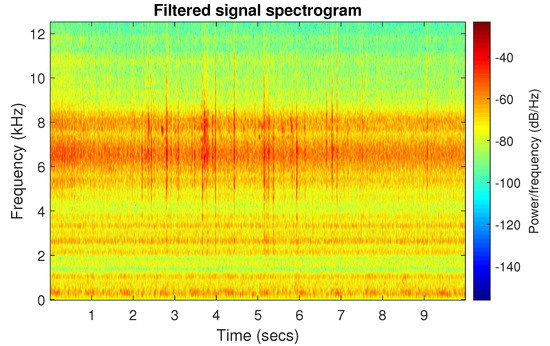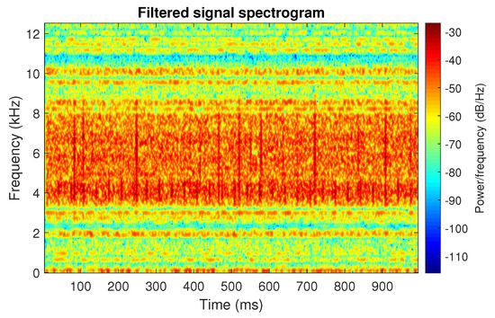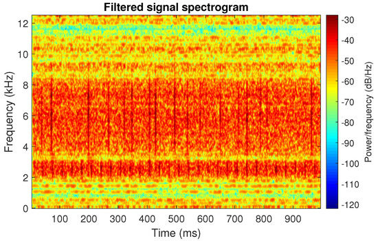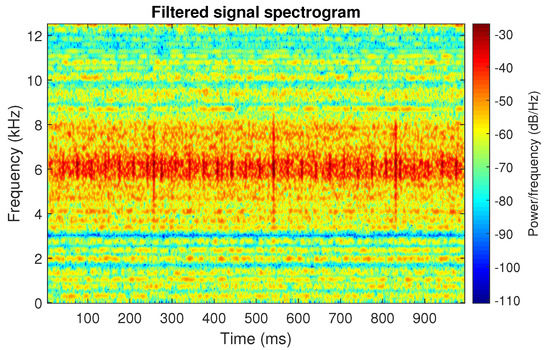 Figure 7. As one can see, the periodic impulses with amplitudes of about 1 are noticeable. The filtered signal does not contain high amplitude impulses associated with heavy-tailed noise. The spectrogram of the filtered signal indicates low energy for the frequency band in the range 3–8 kHz (see