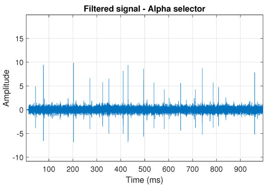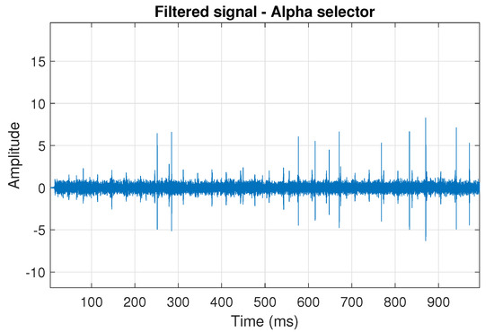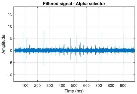 Figure 22a–c. It is worth noting, this band also includes heavy-tailed noise. The filtered signal by the Alpha selector and its spectrogram have been shown in