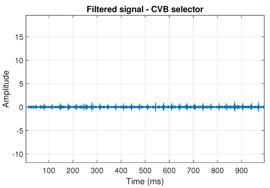 kHz, it has a very narrow frequency range there and it has little effect on the filtration result. Additionally, it indicates the bands with noise around 8 kHz. The amplitudes of the non-cyclic impulses of the signal after filtration with the CVB selector decreased to