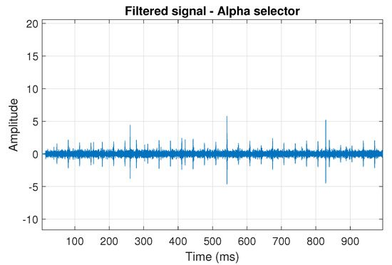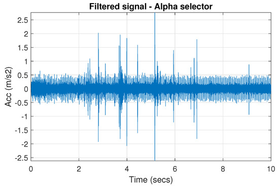 Figure 41c) selectors are calculated. Although the Alpha selector correctly indicates the frequency band of cyclic impulses, it also takes high values in the frequency band corresponding to high-energy noise, i.e., at 5–11 kHz. The signal filtered with Alpha selector still have high non-cyclic amplitudes reaching the value