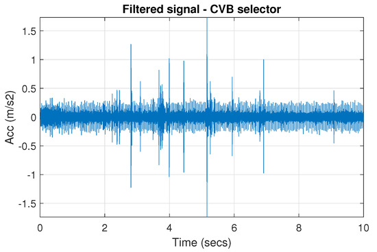 Figure 17). Cyclic impulses with the amplitude of about 1 are visible, but there are no non-periodic impulses associated with the specificity of the machine’s operation. The filtered signal by the Spearman selector does not contain the non-periodic impulses with high amplitude, see