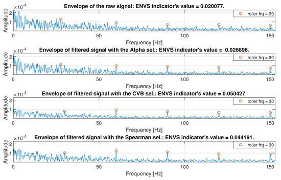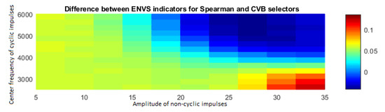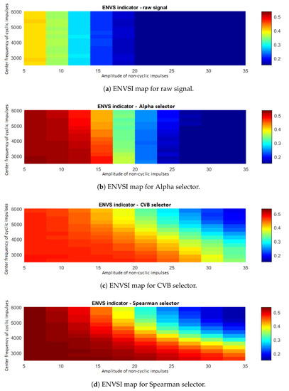 Section 2.5 for more details). As one can see, the approach based on the Spearman correlation has the highest index. It means that the Spearman selector indicates the informative frequency band in the most effective way in comparison to other selectors. For the CVB method, the values are very similar but slightly lower. The worst results we obtain are for the Alpha selector. The ENVS indicator values for this method differ significantly from the other results. It is worth noting that the values in the column corresponding to the Spearman selector decrease as the center frequency of the periodic impulses increases, i.e., with progressing overlap of the bands.