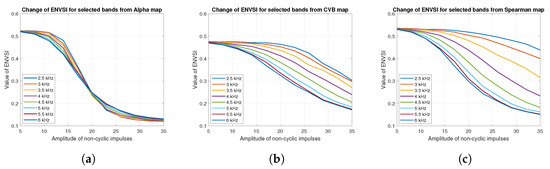 Figure 50b,c), it is noticeable that the high value of ENVSI appears most often. The Spearman selector works well regardless of the degree of the bands’ overlapping for non-cyclic amplitudes in the range of 5–18. For larger amplitudes of the non-cyclic disturbances, the ENVSI value depends on the level of overlapping—the greater the overlap of the bands corresponding to cyclic and non-cyclic impulses, the lower the ENVSI value.