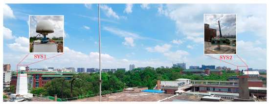 The experiments were conducted in the open area on the roof, and the GNSS observation data of the smartphone were collected and stored by Android app GEO++ RINEX Logger V2.1.3 with RINEX VERSION 3.03, without significant signal obstructions and strong multipath reflectors. The test data were collected over 2 h, and we mainly used the GNSS observations for the first 100 min. The coordinate values of reference points SYS1 and SYS2 were calculated on the NTRF14 in 2020 and treated approximately as an accurate coordinate for comparison in subsequent experiments.