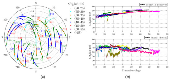 Huawei Mate30 sky plot and the GNSS satellites C/N0 values of the geodetic receiver and Huawei Mate30. (a) Each color corresponds to the C/N0 range of GNSS L1 band signal. (b) The same color on the top and bottom represents the same GNSS satellite. The G, C, and R denote GPS, BeiDou (BDS), and GLONASS, respectively.