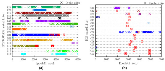 Huawei Mate30 carrier phase cycle slip detection of GNSS L1 band observations. (a) GPS and GLONASS; (b) BDS. The extra cycle slips of GPS and BDS satellites detected by measurement-based polynomial fitting (MPF) were marked with red boxes.