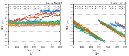 The value of is mainly affected by integer ambiguity, code and phase hardware delay of receiver and satellite, multipath effect, and measurement noise. Therefore, the values always fluctuate within a fixed range, and the trends of values of the Huawei Mate30 and geodetic receiver are shown in Figure 4.