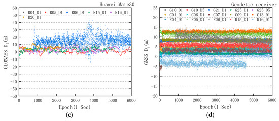 From Figure 4d, the trends of values of GPS/BDS/GLONASS in the geodetic receiver are in line with the expectation. In Figure 4a, the significant change of value mainly concentrates in the L5 band, and the changing trends of value of GPS in L1 band are similar to that of the geodetic receiver. This is different from the experimental result of the Huawei P20 in [8], and it indicates that the quality of GPS carrier phase observations of the Huawei Mate30 has been improved. However, in Figure 4b, we clearly found that all of the BDS carrier phase observations in the Huawei Mate30 were affected by the gradual accumulation of phase errors, and the trends correspond to a change that ranged from −1.203 to −1.548 cm/s, with a mean value of −1.401 cm/s. In addition, when the difference value between the carrier phase observations (in meters) and the pseudorange observations reached the threshold of 50 m, the carrier phase observations (in meters) were consistent with the pseudorange by means of cycle slip. In Figure 3b, taking BDS pseudo random noise (PRN) 04 and PRN 16 for example, the extra cycle slips of PRN 04 and PRN 16 were detected in 3640 epochs and 2890 epochs, which was the same as the time when the carrier phase observations (in meters) were consistent with pseudorange in Figure 4b. The phenomenon of cycle slip after reaching the threshold did not happen in other similar experiments [8,16]. For GLONASS in Figure 4c, a large number of cycle slips, except for the R6 satellite, make carrier phase observations and pseudorange observations coincide with each other. However, there seems to be no accumulated deviation from the value in GLONASS carrier phase observations.