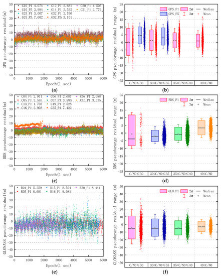 where is the geometric distance between satellite and receiver, is the speed of light in vacuum, is the receiver clock error, is the satellite clock error, is the tropospheric delay, and the other symbols are the same as before. The coordinates of SYS2 were taken as known, and the products such as precise satellite orbit and clock, final ionospheric TEC grid, etc., were provided by the IGS data center. The effects of earth tide, relativity, and Sagnac are modeled and corrected sufficiently, and the code hardware delay is ignored. Moreover, the pseudorange residuals of GNSS satellites are computed with the prior information, and the results are not affected by the parameter estimation based on Kalman filter. Therefore, the receiver clock error is computed by least squares estimation in single point positioning (SPP). The pseudorange residuals of GPS, BDS, and GLONASS are shown in Figure 5, and it should be noted that contains the multipath error.