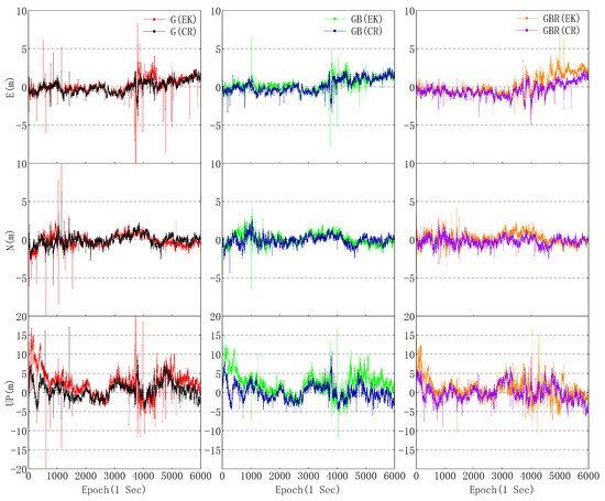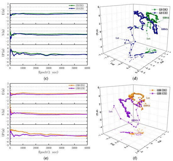 According to the comparison of GNSS(CR) and GNSS(EK) in Figure 6b,d,f, it can be found that the positioning errors of GNSS(CR) are even higher than GNSS(EK) in the first few epochs, but the convergence rate of GNSS(CR) is obviously faster than that of GNSS(EK) with time in Figure 6a,c,e. In Figure 6a, the first time for the horizontal error of GPS(CR) convergence to 0.5 m is 156 epochs, which is much faster than 516 epochs of GPS(EK). The RMS of vertical error decreases from 1.850 m of GPS(EK) to 0.878 m of GPS(CR). The mean horizontal and vertical errors of GPS(CR) reach 0.234 and 0.502 m, respectively, which are lower than 0.267 and 1.205 m of GPS(EK). For the GPS/BDS and GPS/BDS/GLONASS positioning in Figure 6c,e, it should be emphasized that we had to weaken the allocation of carrier phase residuals correction of BDS in both of PPP methods, so as to improve the stability and accuracy of multi-GNSS positioning. The maximum vertical error decreases from 6.204 m for GPS(EK) to 4.607 m for GPS/BDS(EK) and 4.656 m for GPS/BDS/GLONASS(EK). Moreover, the RMS of vertical errors decreases from 1.333 m for GPS/BDS(EK) and 1.545 m for GPS/BDS/GLONASS(EK) to 0.817 m for GPS/BDS(CR) and 0.761 m for GPS/BDS/GLONASS(CR), respectively.