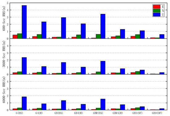 The comparison of RMS of GPS, GPS/BDS, and GPS/BDS/GLONASS positioning errors in each direction during different periods is shown in Figure 7, and the RMS of single and dual frequency PPP errors of the geodetic receiver are added for reference. In the first 10 min, the RMS of three-dimensional positioning errors of GPS(CR), GPS/BDS(CR), and GPS/BDS/GLONASS(CR) are 2.444, 2.160 and 1.386 m respectively, which are much lower than 4.726, 2.969 and 3.488 m for GPS(EK), GPS/BDS(EK), and GPS/BDS/GLONASS(EK). Meanwhile, the RMS of horizontal and vertical errors of GPS/BDS/GLONASS(CR) is 0.474 and 1.302 m, respectively, which are close to 0.661 and 1.119 m for GEO(SF). Then the RMS of GPS/BDS/GLONASS(CR) positioning errors gradually decreases with time, of which the horizontal and vertical parts decrease continuously from 0.306 and 0.798 m within 60 min to 0.250 and 0.761 m within 100 min, respectively. However, the three-dimensional positioning errors of the proposed static PPP algorithm based on C/N0-dependent step function variance stochastic model decrease by different levels, no matter which group of GPS, GPS/BDS, and GPS/BDS/GLONASS is considered.
