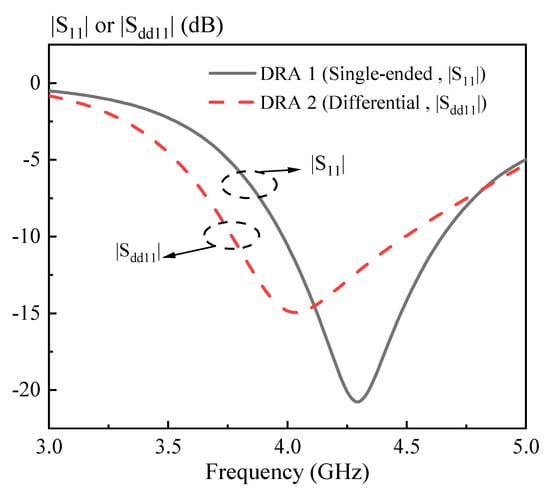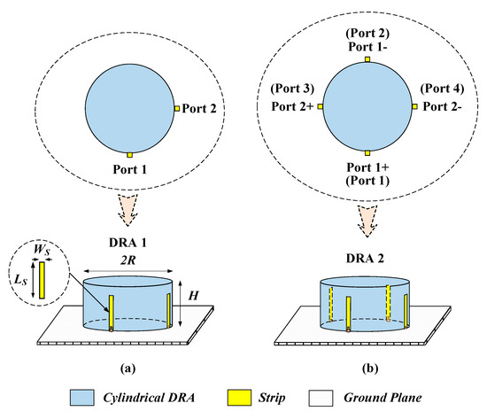 2.2. Strips-Fed Dual-Polarized Cylindrical DRA Using Single-Ended and Differential Ports
