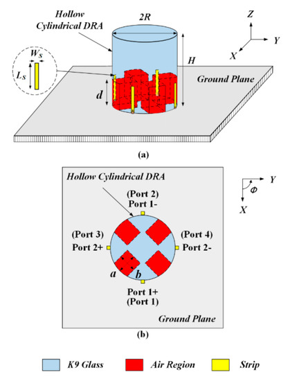 - Zou, L.F.; Abbott, D.; Fumeaux, C. Omnidirectional cylindrical dielectric resonator antenna with dual polarization. IEEE Antennas Wirel. Propag. Lett. 2012, 11, 515–518. [Google Scholar] [CrossRef]