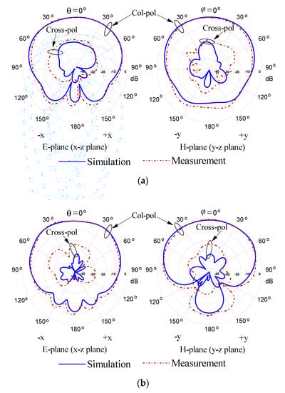 The simulated and measured radiation patterns of the proposed DRA at differential-port 1 for the three DRA modes are shown in Figure 16. In the measurement, a broadband external 180° hybrid coupler (2–18 GHz) was applied to provide the differential signals. Referring to the figure, symmetrical broadside radiation patterns were presented for the three resonant modes. In the boresight direction, the co-polarized field is stronger than its cross-polarized counterpart by more than 20 dB for the E- and H-planes. It is also observed that the level of the cross-polarization field of all angles is smaller than −20 dB, which is due to the use of differential feeding.