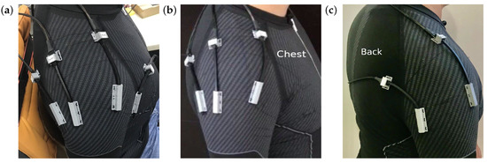 The era of flexible systems is on the rise, and a new generation of motion sensors is emerging. The wearable flexible sensors (WFSs) are created with flexible materials which are inexpensive to manufacture, have better mechanical and thermal properties than non-flexible sensors and are lightweight and comfortable for motion capture [5]. Still, there are important features to consider, such as stretching, compression, bending and twisting [6]. With the use of wearable systems, there is a promising path to contribute to a meaningful diagnosis of shoulder conditions, as well as a concise follow-up for rehabilitation evolution [7]. Upper extremities of the human body have complex kinematics and contain a large number of degrees of freedom (DOF) [8]; the glenohumeral (shoulder) joint, for instance, is a complex joint with more than three DOF [9]. WFSs could properly estimate the kinematics of the shoulder due to its physical characteristics by eliminating the use of rigid parts and even communication cables in some cases [10,11,12,13]. It has been proved that it is possible to estimate the angles of the arm with respect to the trunk by placing sensors on the body [14,15,16,17]. Additionally, the use of compression jackets, combined with soft sensor arrays, makes it possible to accurately estimate the position of the limb [18,19], as well as to place the sensors onto the skin without the use of adhesives or other preparations such as invasive intrusions in the user’s body. However, a disadvantage of compression garments is that sweat can cause damage when it comes into contact with electronic devices.