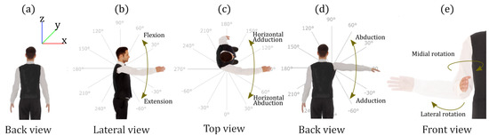 Gestures that define the work space of the right arm. (a) Rest position. (b) Flexion/extension gesture corresponding to the plane. (c) Horizontal abduction/adduction corresponding to the plane . (d) Abduction/adduction gesture corresponding to the plane. (e) Depiction of the rotation of the shoulder, named .