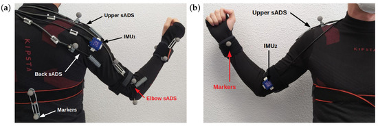 To verify the estimation proposed in this article, the OptiTrack system was used for ground truth data. A total of 10 reflective pointers and four cameras from the OptiTrack system [32] were placed, providing submillimetre precision. The markers placement generated straight lines between each section to be analysed. Two markers were placed on the back to know the inclination of the user—two on the shoulder (just above the fixed parts of the shoulder sADS), two on the arm, two on the forearm, one on the elbow and two on the wrist [33], as shown in Figure 3.