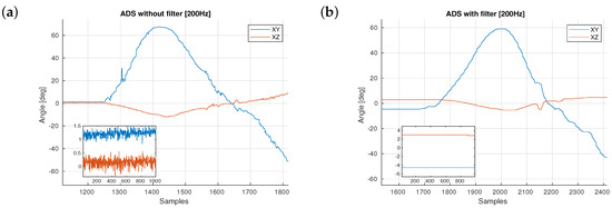 The angular displacement of the sADS was obtained by a differential capacitance measurement. The sensor repeatability, according to the manufacturer, is 0.18. However, when taking measures from the sensor at 200 Hz, a noise of a maximum amplitude near 3 was observed. A set of sensor samples obtained while bending the sensor was stored and a frequency domain analysis was realised over those samples. Following frequency spectrum analysis, a low-pass first order infinite impulse response (IIR) digital filter with a cut-off frequency of 10 Hz was applied to the raw data provided by the sensor to reduce noise. Finally, a dead zone for sampling data was added to the filter (see Figure 5).
