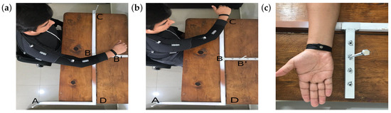 Calibration frame top view. (a) Shows arm pose at the point B of the frame to estimate the length of the arm and forearm with a known distance . (b) Gesture performed for redundant calculation towards point C. (c) It shows the bracelet tight and a magnet to guarantee the same pose of the wrist with the pin on the frame.