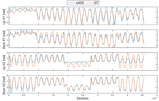 By evaluating the fusion algorithm with the gesture classifier, an overall improvement in angle measurement was observed. This algorithm used the sensor signal that performed best (upper or back sensor) for each type of gesture, resulting in the smallest measurement error of the shoulder angles. The RMSE for cyclical movements was 2.93. In the case of free movements, the algorithm was allowed to interpret each signal from the sADS sensors and classify the movements, obtaining a significant improvement in angles with an RMSE of 3.71. Because the mean angle error decreased, the position estimate improved (Table 8). It should be mentioned that the largest error obtained for the position estimation using the weighted fusion algorithm was 60.7 mm, 43% less than the largest error without the weighting. The smallest was 12 mm, only 19 mm better than the smallest without the weighting.