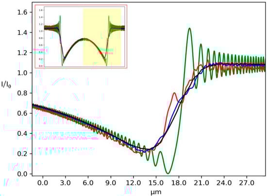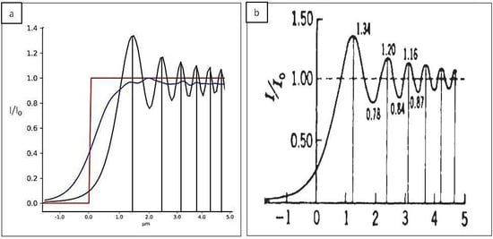 We first simulated a fully coherent source (N = 1) and we observed its capability of creating a diffraction pattern after passing through a sharp edge (black curve, Figure 3a) looking at its normalized intensity pattern. The simulation was performed with the following parameters: wavelength λ = 1.38 × 10−10 m, number of points M = 3000, and a propagation distance z = 40 cm. The oscillations that can be seen on the black line of Figure 3a for a low number of Gaussians inside the source (N = 5) are due to its high level of coherence. The measured fringe visibility is related in fact to the magnitude of the complex degree of coherence within the illumination beam [23]. Taking the same experimental condition but increasing the number of Gaussian sources (N = 100), making the beam partially coherent, the oscillations vanished (blue line in Figure 3a) since they are averaged between many shifted beams. The diffraction pattern created by the object in the case of a coherent illumination corresponds to the one tabulated in the literature (Figure 3b) [24] (p. 180).