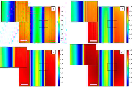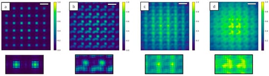 Illuminating the Hartmann mask with a fully coherent beam (Figure 10a) reproduces the periodic square apertures of the mask, as expected. Decreasing the level of coherence of the source induces a blurring effect (Figure 10b,c) as well as a superposition of the signal coming from different holes. At the highest number of individual sources (N = 1000, Figure 10d) the image of the periodic structure is completely lost.