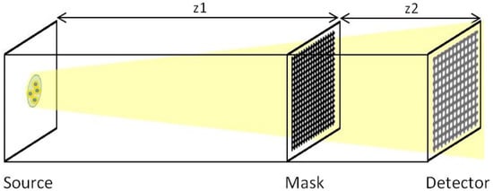 Schematic representation of the simulated set-up: the Hartmann mask is placed in the beam path between the source and the detector. z1 is the source to mask distance and z2 is the mask to detector distance.