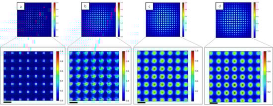 The pixel size of the detector is 0.066 µm. Since the reconstruction of the wavefront is based on the integration of the signal of each beam to calculate their displacement [12,25], we are going to investigate the occurrence of diffraction and the cross-talk between adjacent holes when changing the coherence of the illuminating beam.