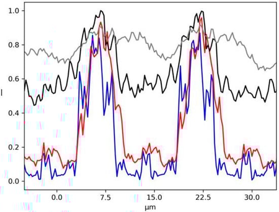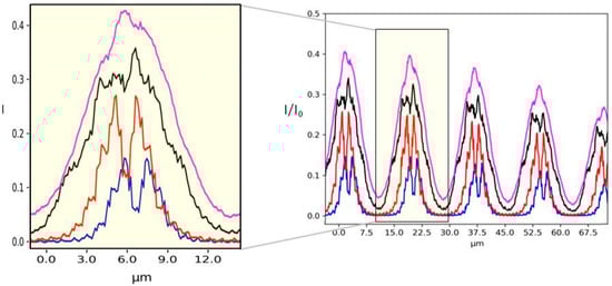 Single line plots of the 2D image shown in Figure 10 are given in Figure 11. This last example shows the consistency of our simulation given a certain degree of coherence of the source: the system is reproducing the exact period structure at the Talbot distance as a consequence of the diffraction interference phenomena, while this effect cannot be seen in the case of an incoherent illumination.