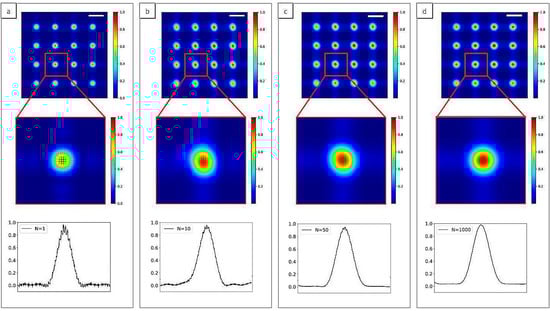 In Figure 7, images of the Hartmann patterns in the case of N = 1, 10, 100 and 1000 are reported. Diffraction effect from the hole edges is clear in the case of coherent illumination (N = 1, Figure 7a), while the displacement of the sub-sources associated with the interference of the propagated beams induces a strong change on the pattern N = 10 (Figure 7b). Decreasing the degree of coherence of the incident beam decreases the visibility of the diffraction pattern (N = 100, Figure 7c), and in the case of strongly incoherent illumination (N = 1000, Figure 7d) a Gaussian shape for the diffraction pattern of each hole can be seen. Such Hartmann patterns are characteristic of very compact wavefront sensors. They have been observed on the high numerical aperture EUV sensor [26,27].