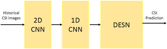 As detailed in [2], the CNN based architecture consists of a 2D CNN and a cascade 1D CNN. In fact, the first 2D convolution module, as depicted in Figure 1 the CNN modules take as input the historical CSI images, i.e., the images of the data collected along time on which the training is performed. More specifically, the 2D CNN is responsible for the frequency extraction, in which there is a composed of a set of filters in parallel and then a set of weights. Consequently, the state representative vector is extracted by the 1D network from the frequency representative vectors [2]. Therefore, the last component of the proposed framework is the ESN module. The ESN is a particular RNN, based on the Reservoir Computing (RC) paradigm [27,28] which, recently has been considered an effective approach for efficiently training the RNNs. Despite many instances of the RC methodology have been presented in the literature [29], the ESN [30] is one of the most known models [31,32,33,34,35]. Roughly speaking, the ESNs belong to a subclass of the RNN, named as the recurrent randomized neural networks [36], whose state dynamics are implemented by an untrained recurrent hidden layer [37].