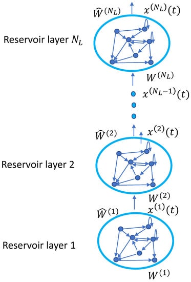 As widely discussed in the literature [37], the reservoir of a DESN is characterized by a hierarchy of cascade recurrent layers, where the output of each layer represents the input for the next one, as illustrated in Figure 2. At each time step t, let be the external input dimension, and let be the number of reservoir layers. Furthermore, each reservoir layer has recurrent units. Then, the external input at time t is defined by , while represents the state of the reservoir layer i-th at time slot t. At each time slot t, the global state of the DESN, i.e., the state in all the reservoir layers is expressed by
