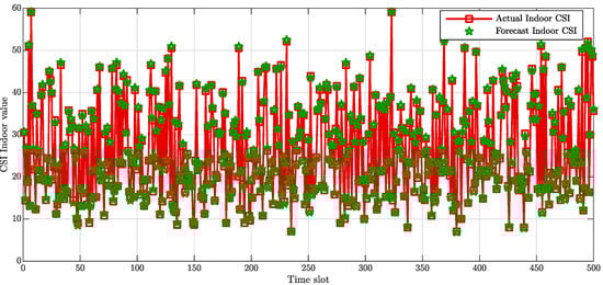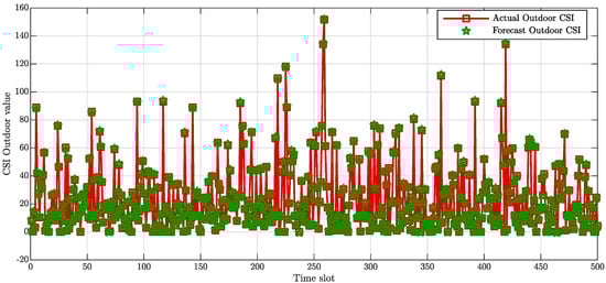 The comparison between the collected data and the data predicted are reported in Figure 3 and Figure 4, with regards to the indoor and outdoor conditions scenario, respectively. Figure 3 exhibits the closeness between the actual data collected within a building and the predicted values. Similarly, Figure 4 shows that the forecast CSI are remarkably close to those collected within an outdoor environment.